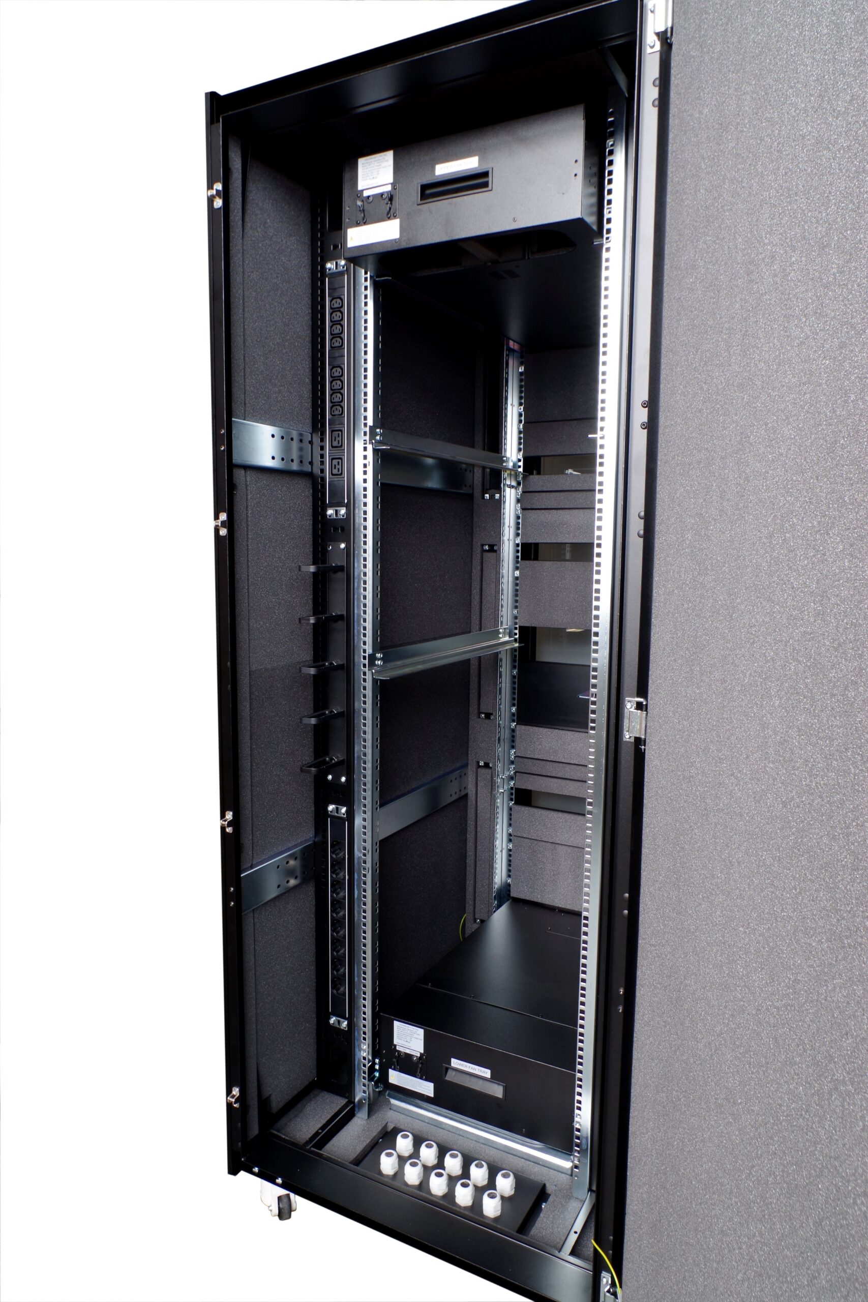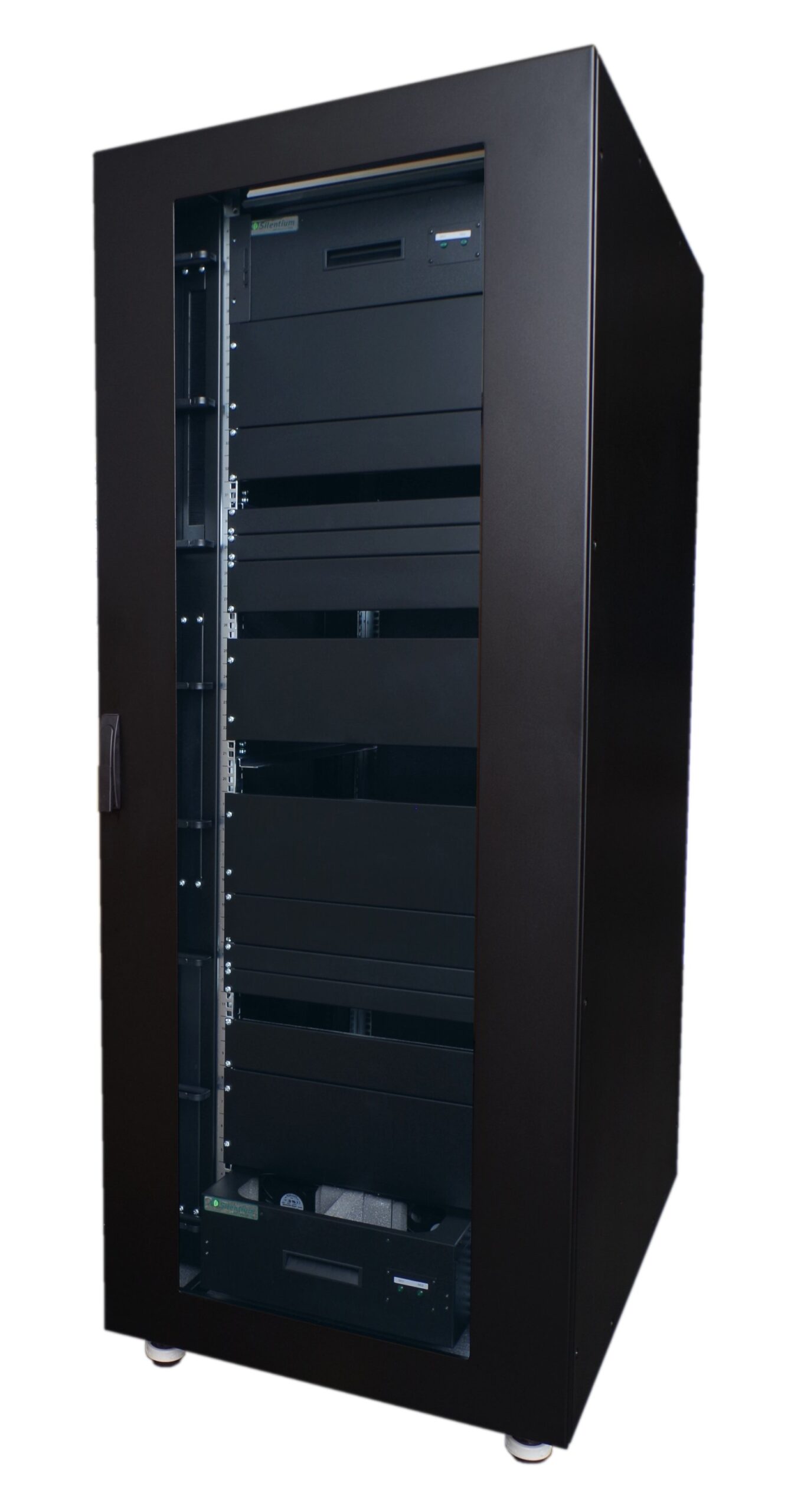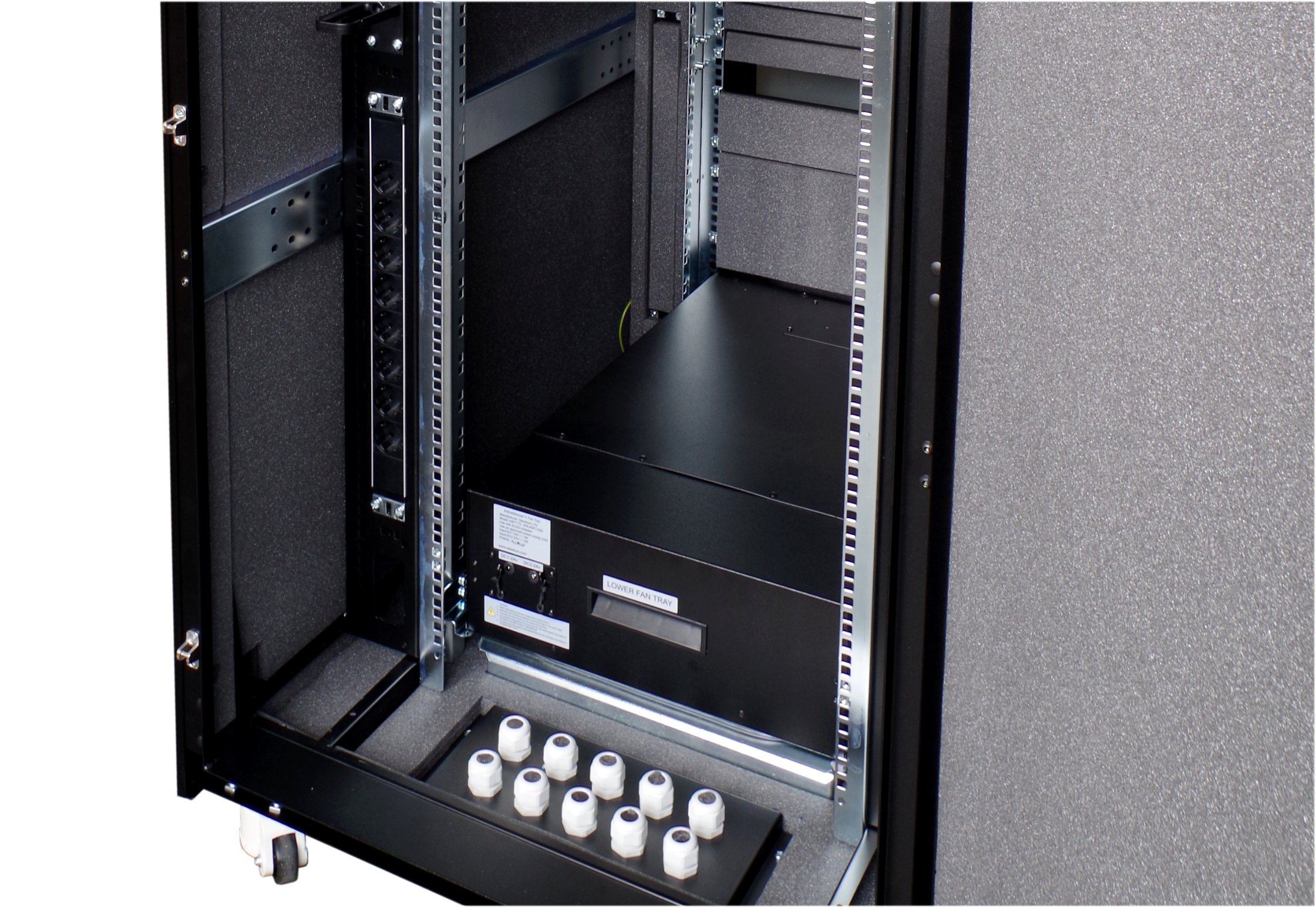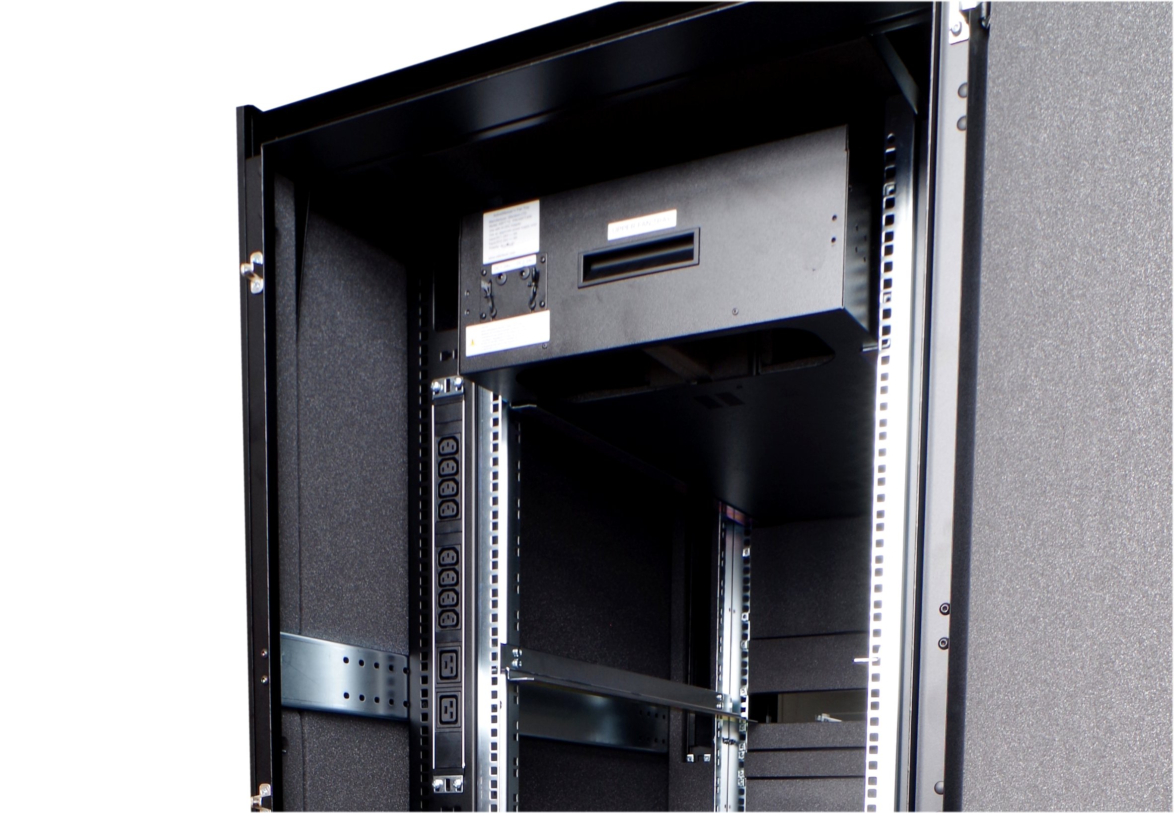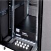19” acoustic omara – “server soba v 19” omari”. Zvočna izolacija in sistem za aktivno zmanjševanje hrupa zniža raven hrupa na običajno raven in omogoča delo v prostoru z glasnimi strežniki. Prezračevanje omogoča vgradnjo opreme do 8 kW, aktivno zniževanje hrupa zmanjša nivo do 30 dB(A).